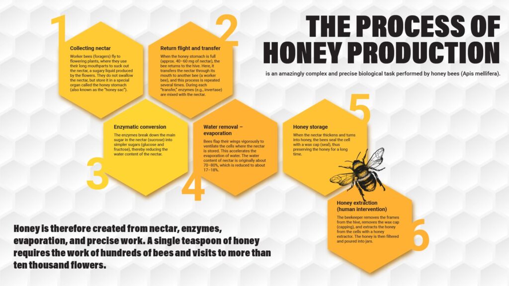 The bees’ work is true teamwork: forager bees collect nectar from flowers, enzymes begin to transform it, and back in the hive more worker bees take over, further thickening, drying, and preparing it for long-term storage. The journey of nectar – from flower to honeycomb – consists of many small, carefully coordinated steps. Without these, honey simply would not exist.
