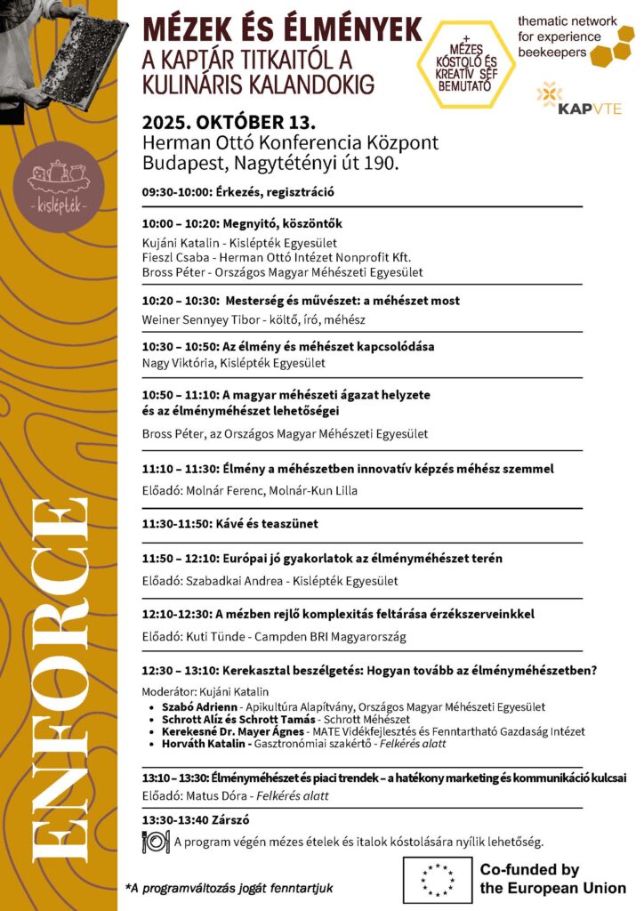 A program során szó lesz a méhészet művészetéről és innovációiról, a magyar ágazat helyzetéről, valamint az európai jó gyakorlatokról. Résztvevőink megismerhetik a méz érzékszervi titkait, a gasztronómiai lehetőségeket és az élménymarketing eszközeit is.